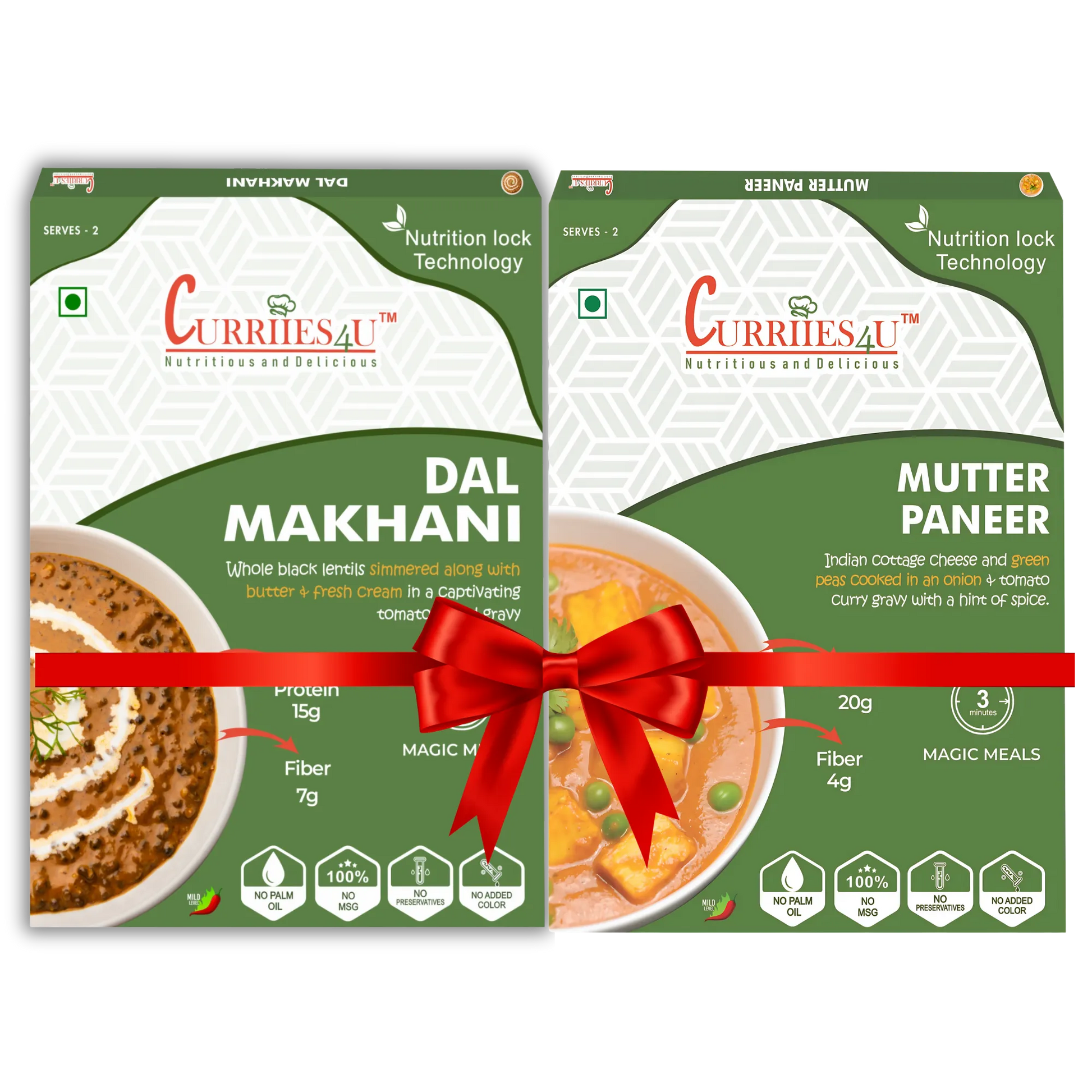 Savor the delicious taste of Dal Makhani and Mutter Paneer with this ready-to-eat combo pack of 2 from Curriies4U. Made with 100% natural ingredients, this meal offers authentic North Indian flavors with no preservatives, no MSG, and no artificial additives.