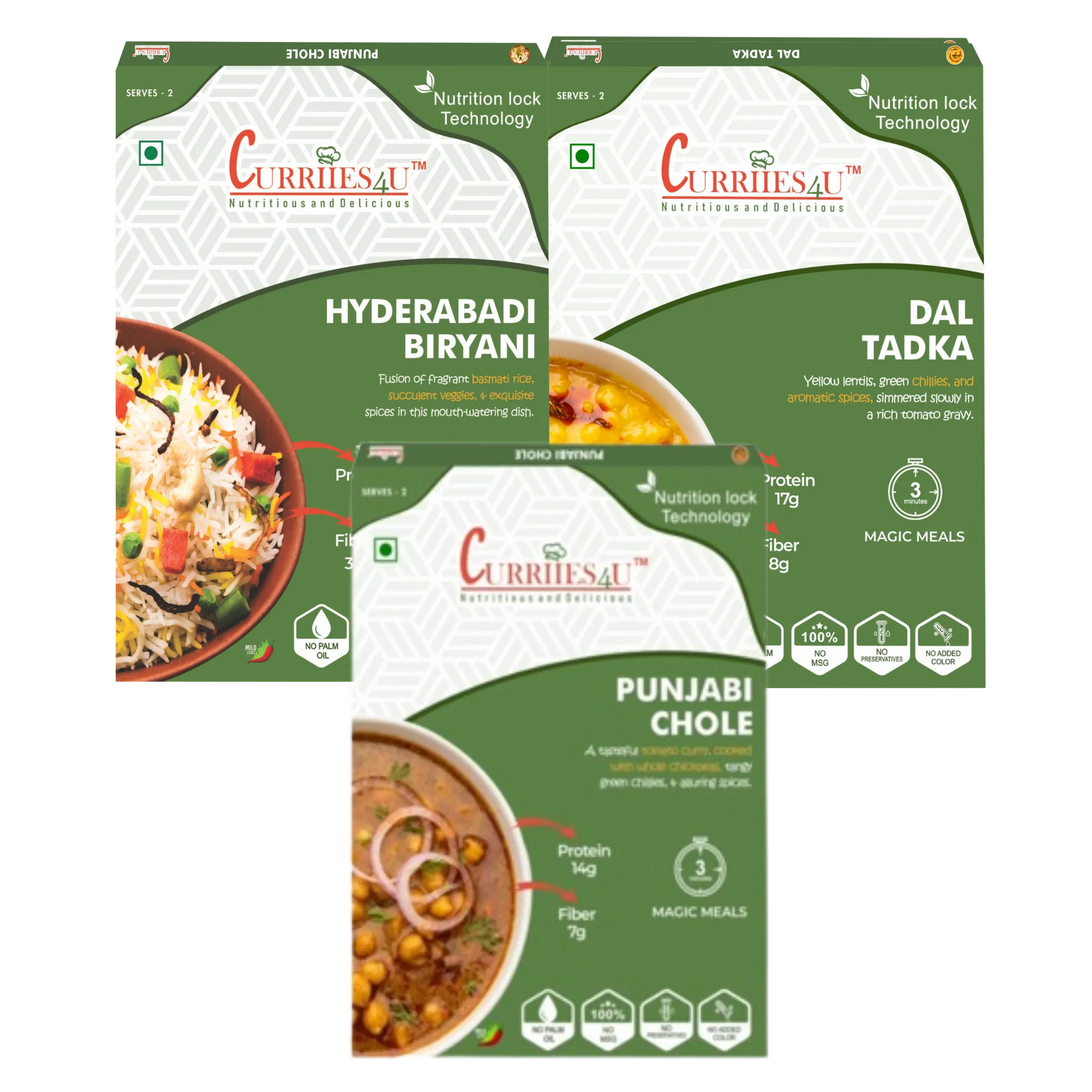 Punjabi Chole, Dal Tadka & Vegetable Hyderabadi Biryani – Pack of 3 | Authentic Indian Meals