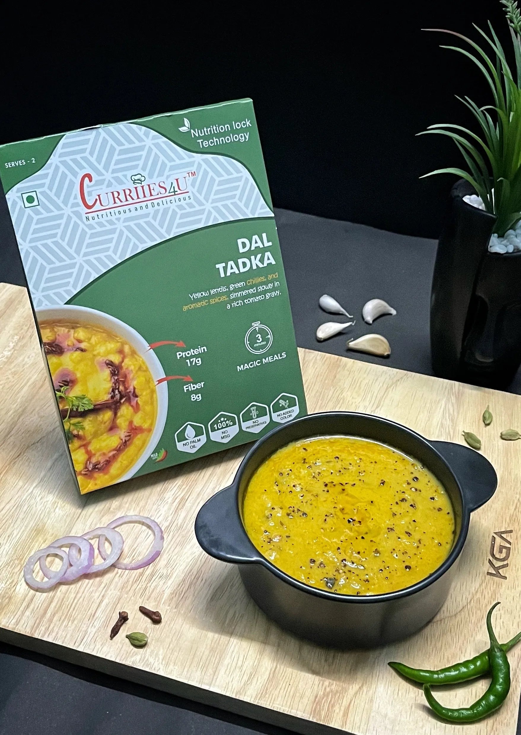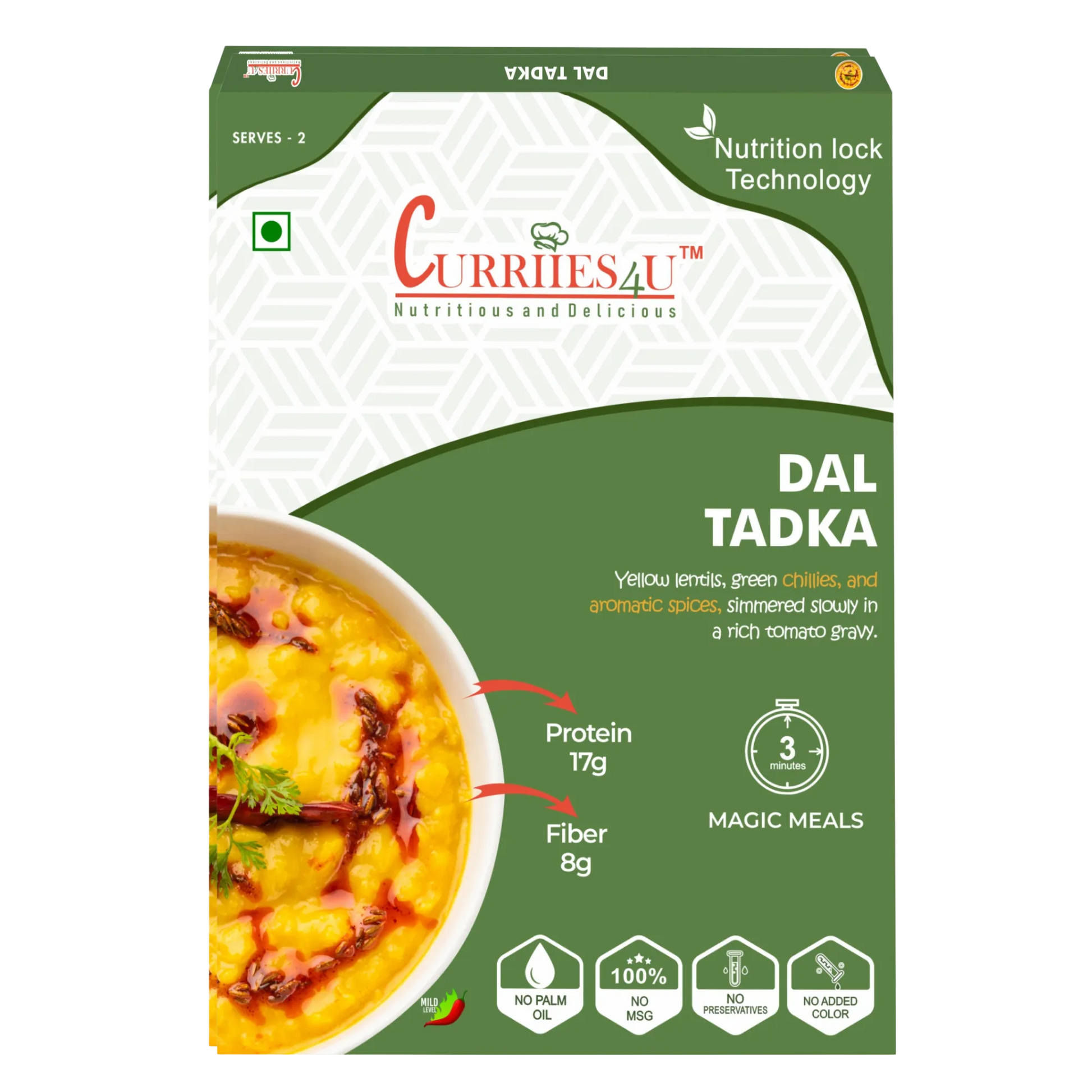 Enjoy Curriies4U Dal Tadka, a ready-to-eat meal made with premium Arhar Dal (Toor Dal) and infused with authentic Indian spices. This preservative-free food contains no MSG, no palm oil, and no artificial additives, offering a healthy convenience food option. Ready in just 3 minutes, it's perfect for busy professionals, students, and travelers. Savor the home-cooked taste of North Indian cuisine with this flavorful Indian food. Order now at www.curriies4u.com for a delicious, travel-friendly meal anytime, anywhere!